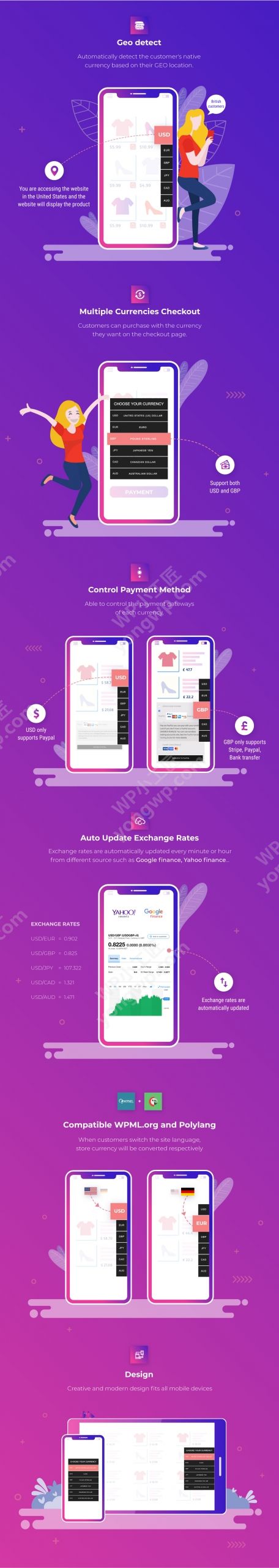 如果您拥有WooCommerce商店,则WooCommerce Multi Currency是您的必备插件。WooCommerce多币种允许您的客户在货币之间进行切换,并帮助您的商店接受多币种付款。汇率可以手动或自动设置。该插件可以自动获取客户的地理位置信息,并以客户的本币显示价格。