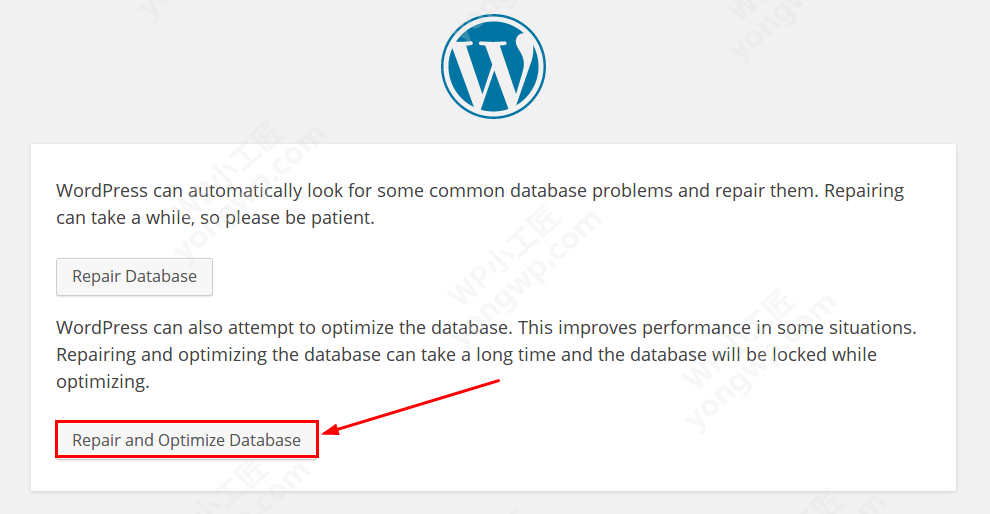4.通过yongwp.com/wp-admin/maint/repair.php (yongwp.com换成你自己的域名)访问wp引导修复文件,选择Repair and Optimize Database。
