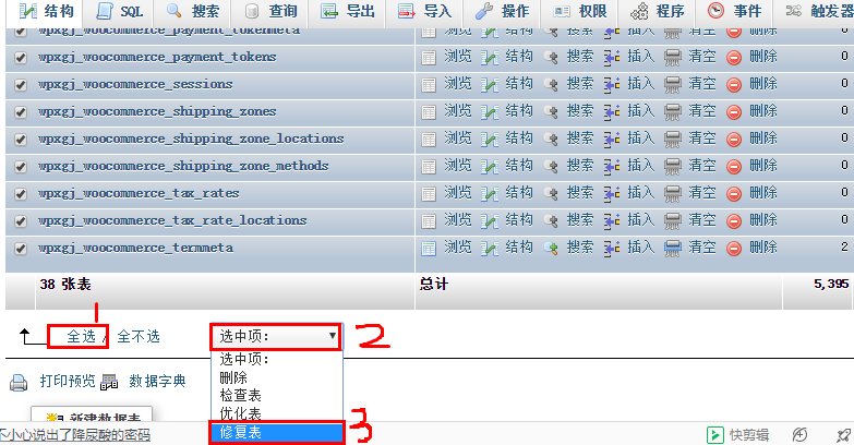 通过phpmyadmin 进入数据库管理界面–>选择网站对应数据库–>全选所有表单–>页面下方 下拉选择修复表单