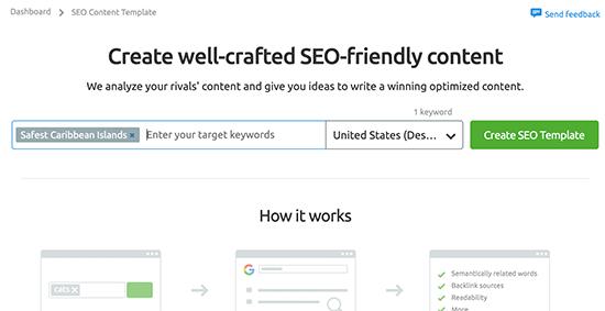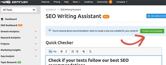 您需要做的第一件事是访问SEMRush SEO Writing Assistant网站并点击“创建新模板”按钮。
