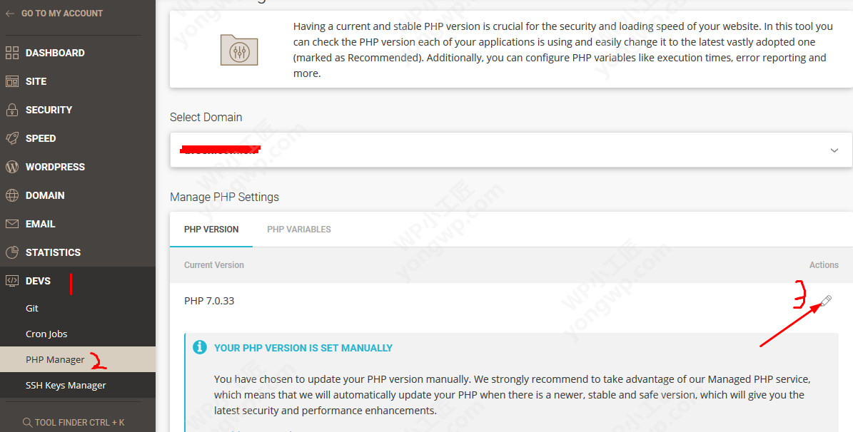 步骤:siteground管理界面–>DEVS–>PHP Manager