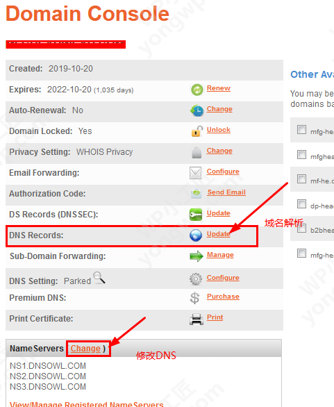 2.2 域名解析选择 DNS Records 后面的update,DNS修改选择下方的 Name Servers 后面的change